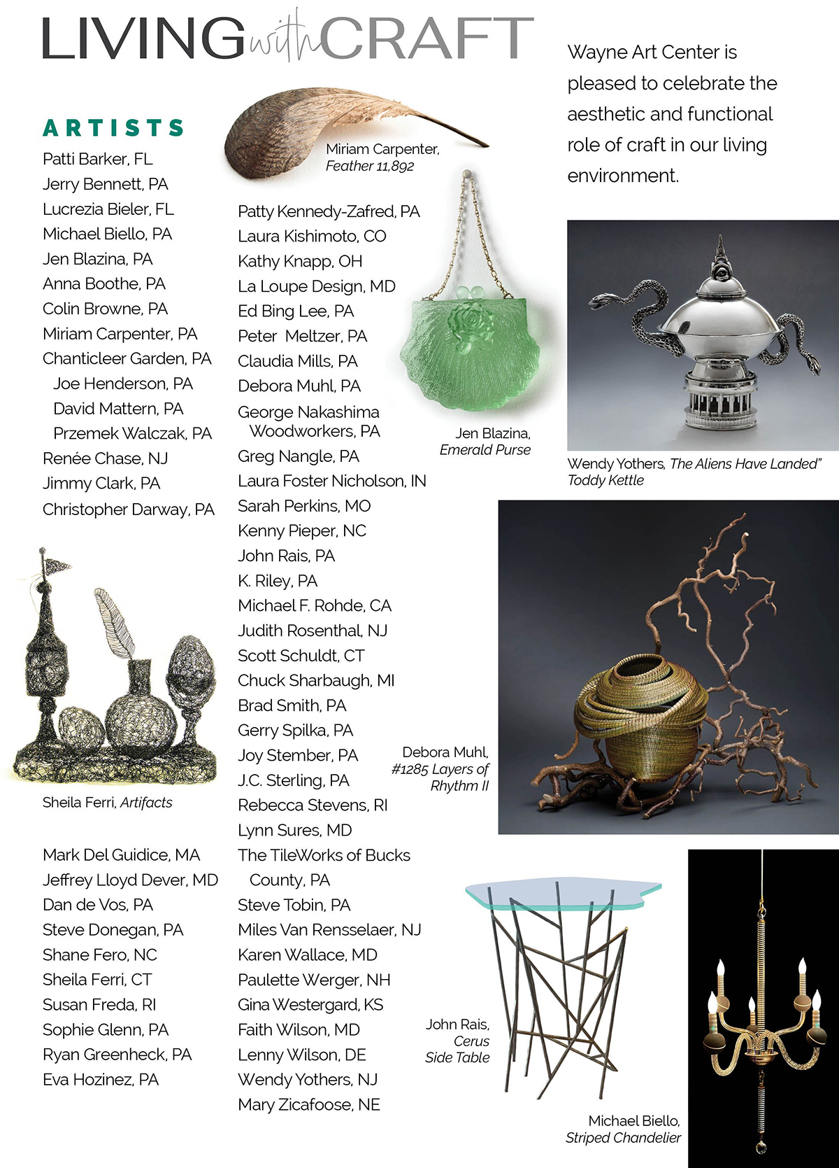 Wayne Art Center is pleased to showcase Living with Craft, an eclectic collection of contemporary craft featuring a diverse range of mediums that represent and celebrate the aesthetic and functional role of craft in our everyday environment.